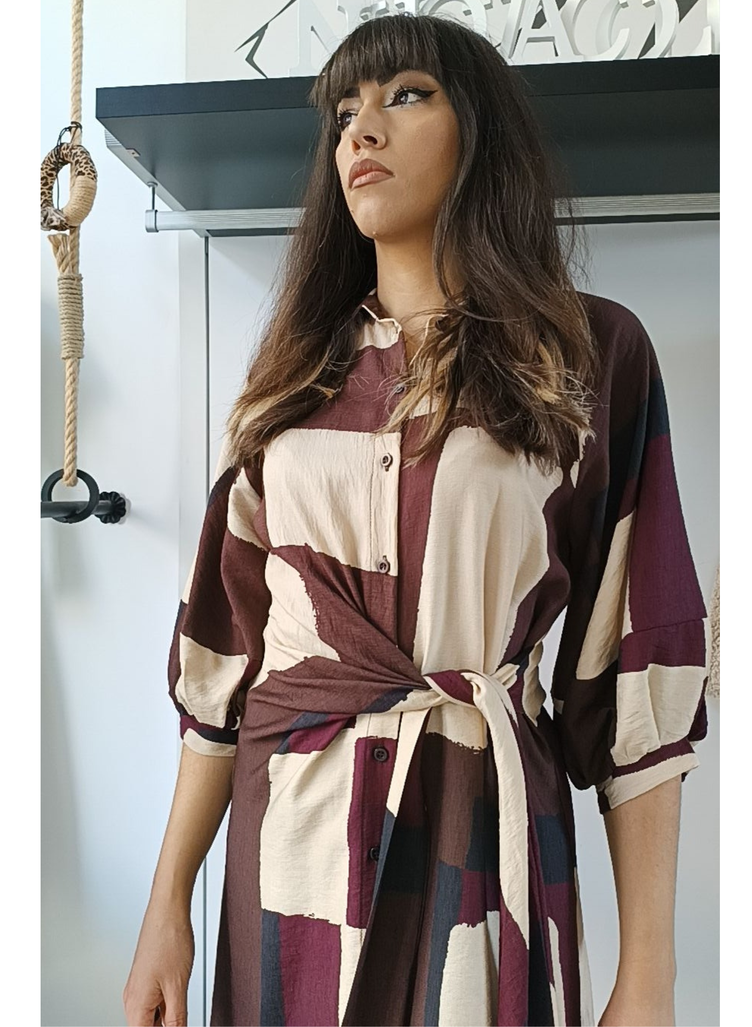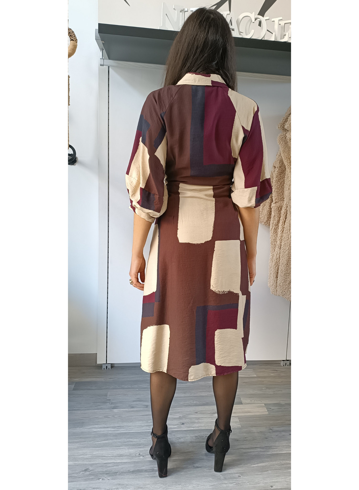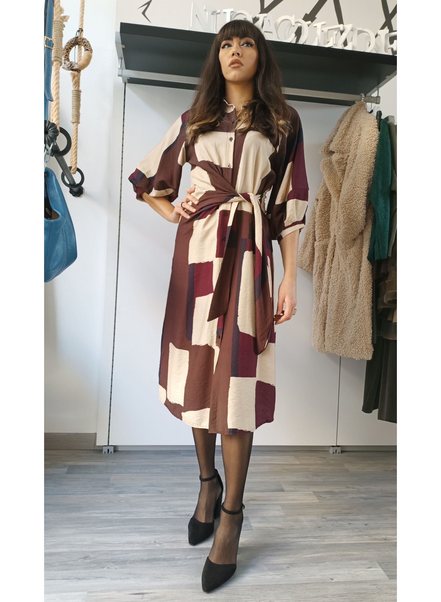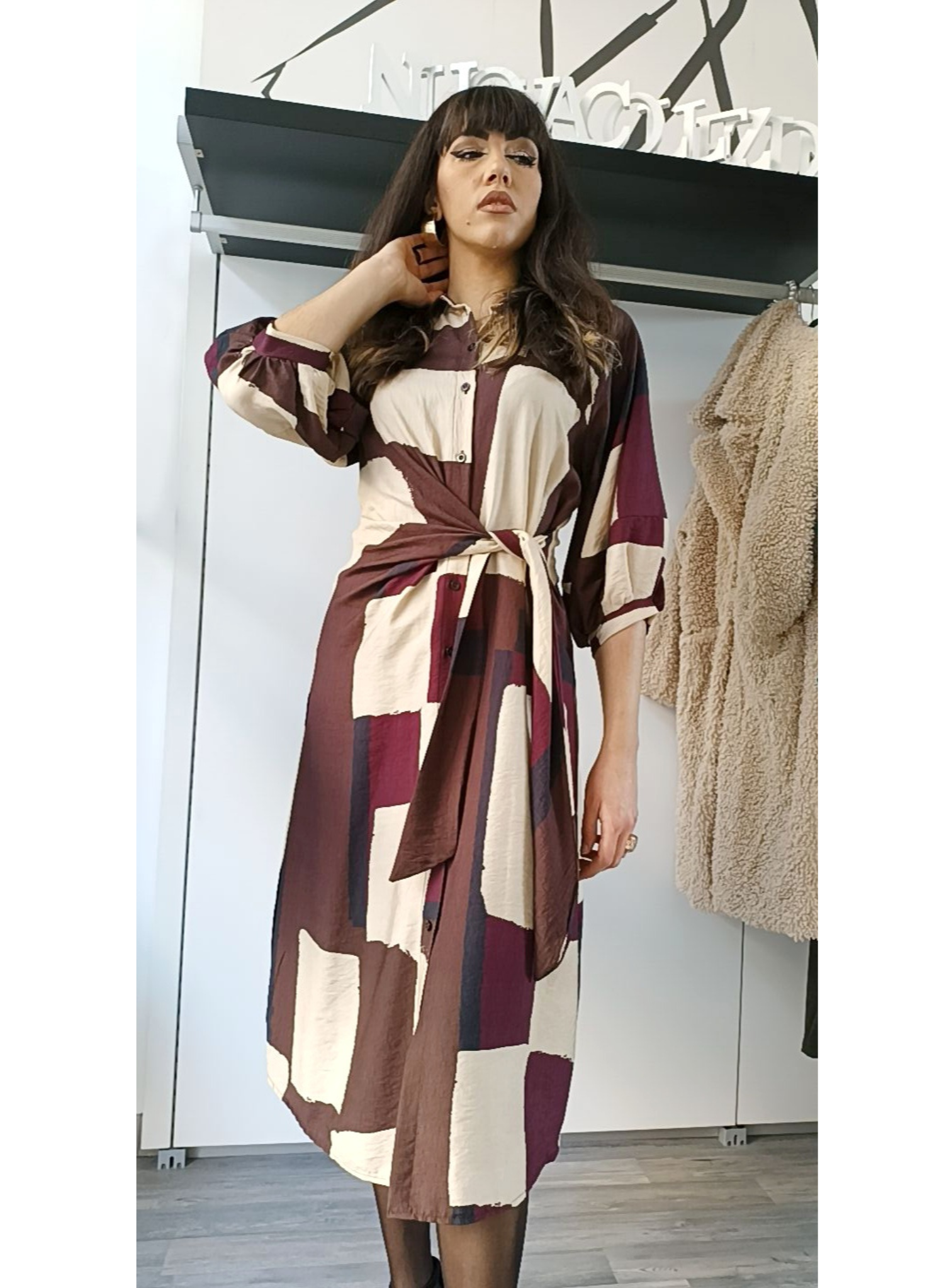 Abito chemisier, midi, in fantasia astratta, dal richiamo etnico