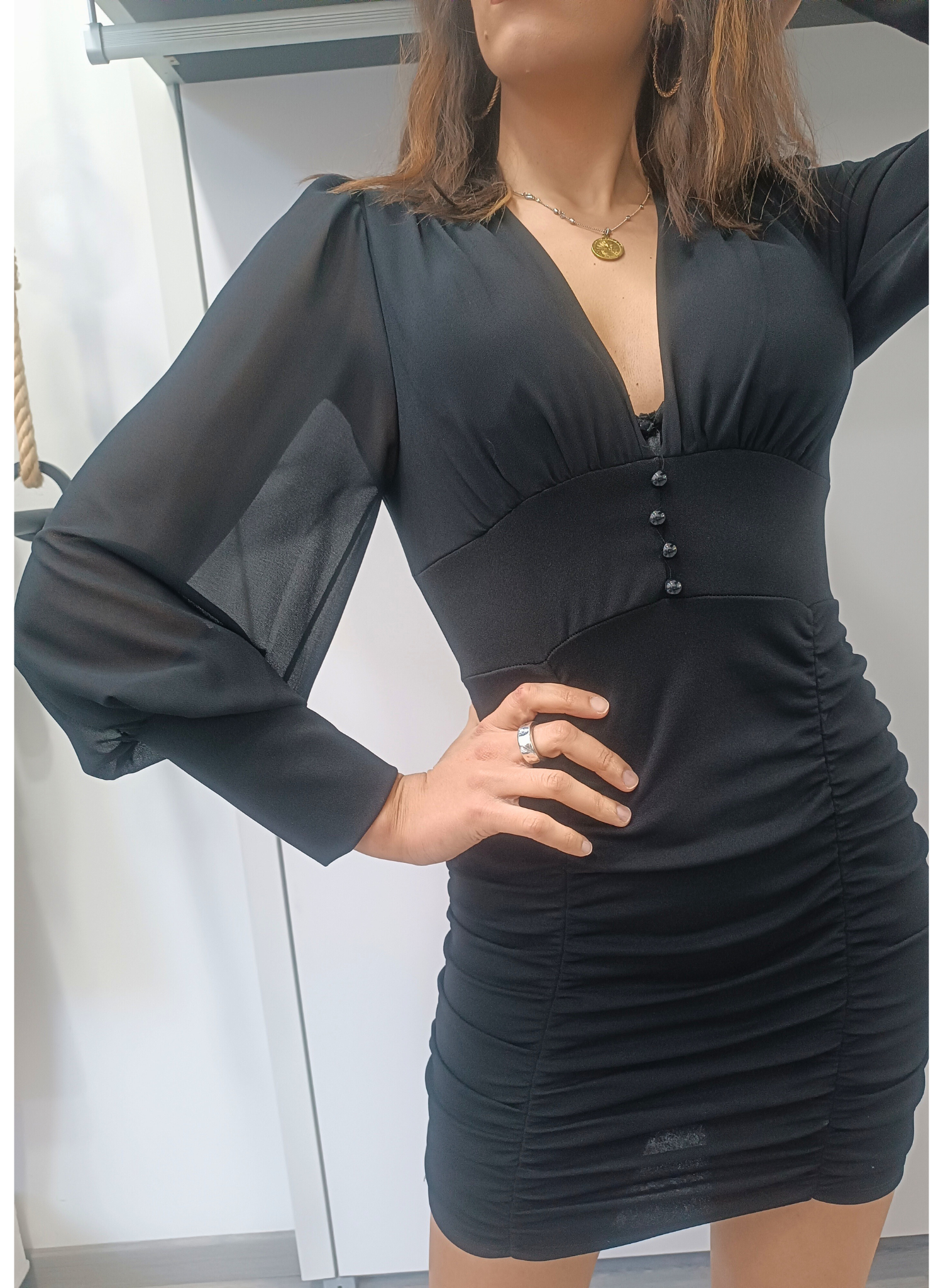 Abito corto a tubino, aderente, in colore nero, modello drappeggiato sulla gonna