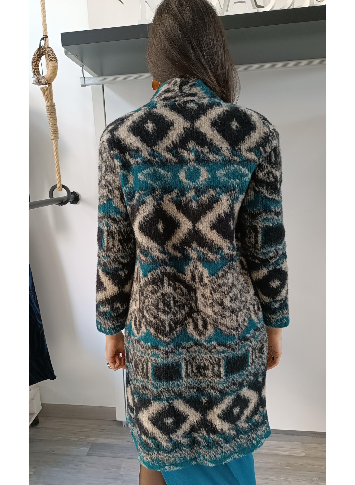 Cardigan in fantasia astratta, dal richiamo etnico, nei colori dell'ottanio, del nero e del ghiaccio.