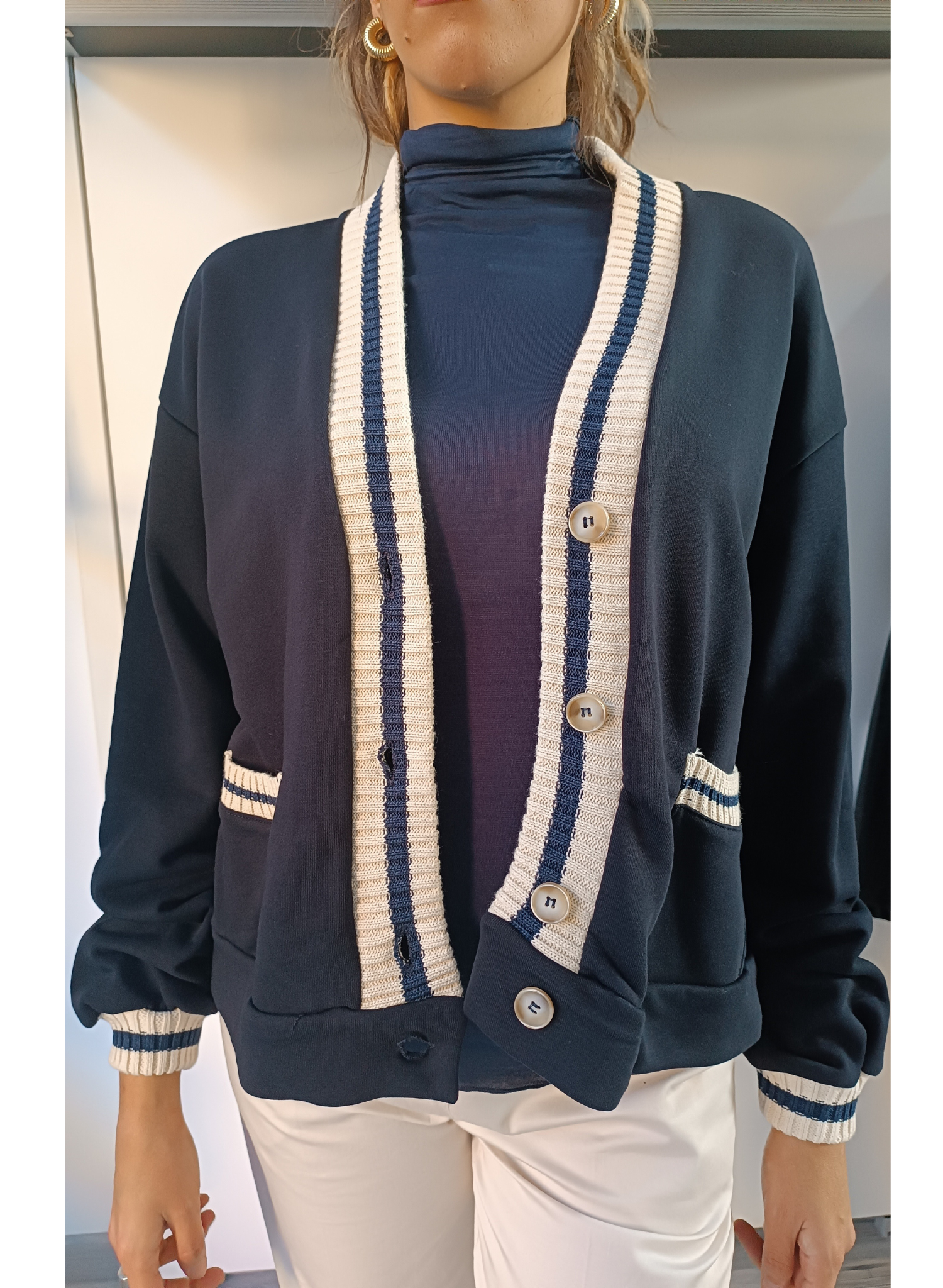 Cardigan Blu, in maglia, dallo stile college, con righe a contrasto, panna e blu, su scollo, polsini e tasche. Chiusura frontale con bottoni