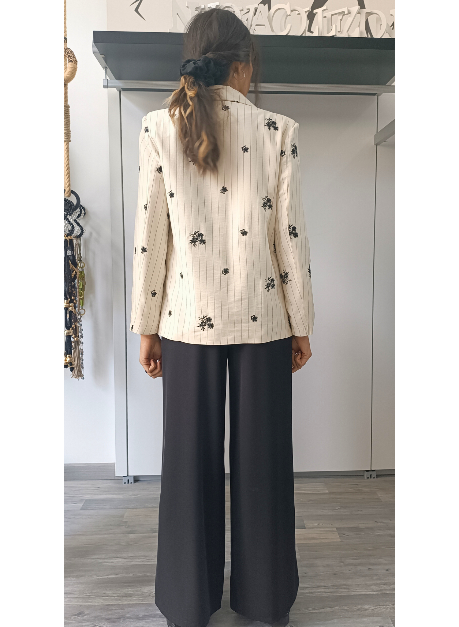 E' foderata e ha come particolarità dei fiorellini ricamati, in nero, su tutta la giacca