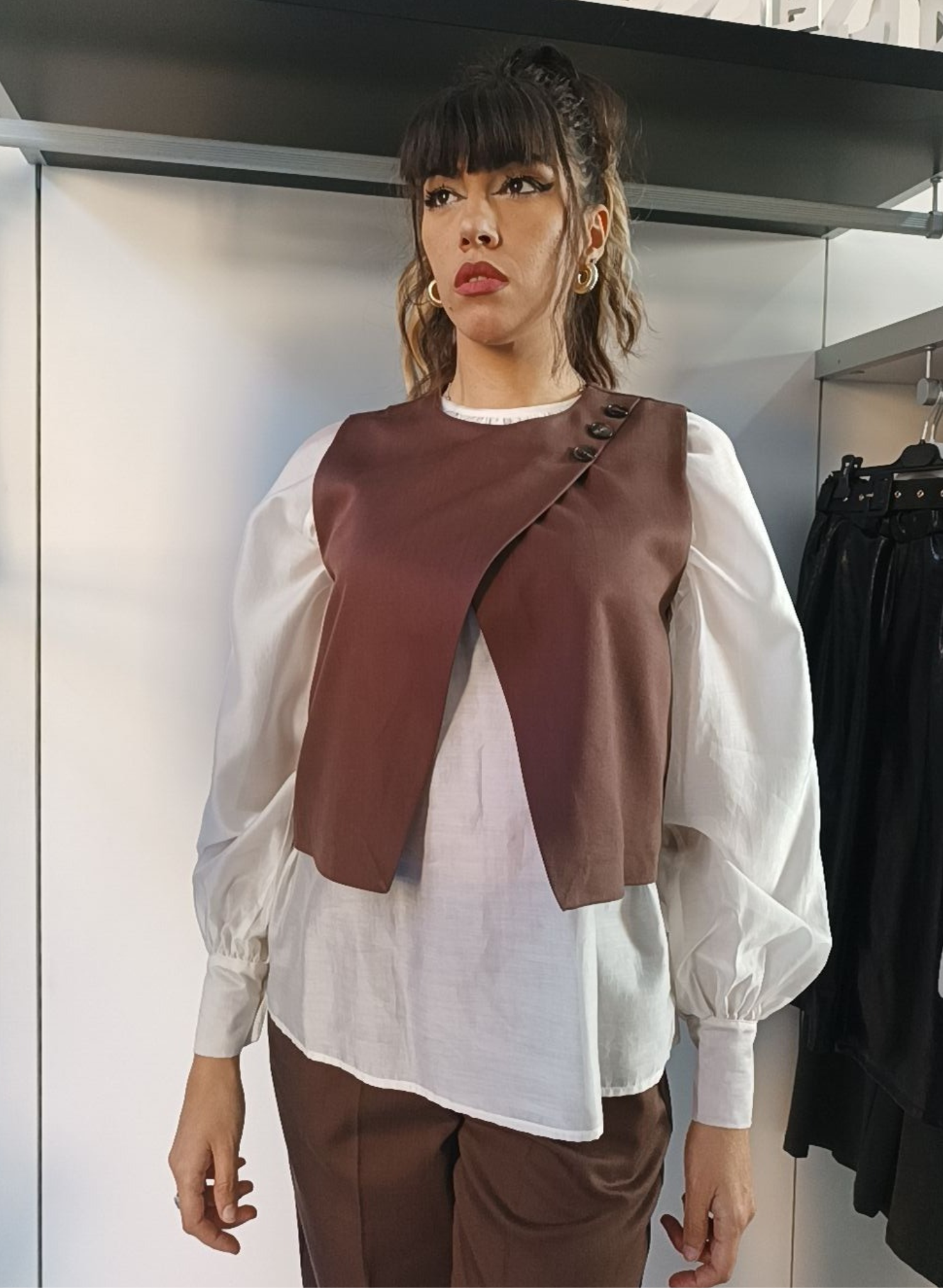 Gilet Top colore marrone bruciato. Modello molto particolare, in quanto lo si può usare da gilet sovrapponendolo a camicie e bluse oppure usato da solo, diventa un delizioso top.
