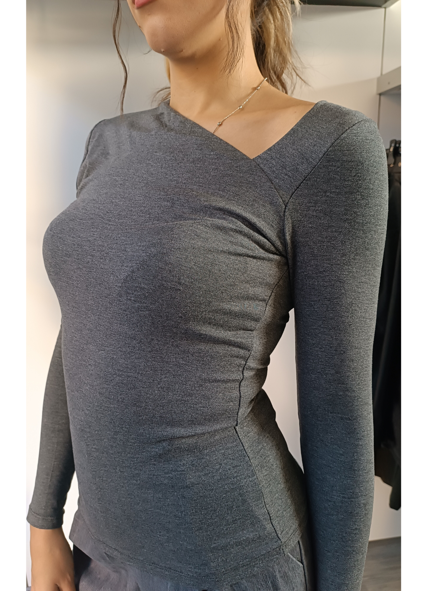 Maglia grigia, a maniche lunghe, realizzata in morbido jersey di viscosa, impreziosita dallo scollo asimmetrico che ne definisce la linea.