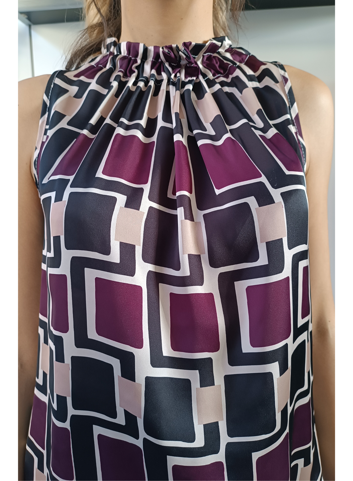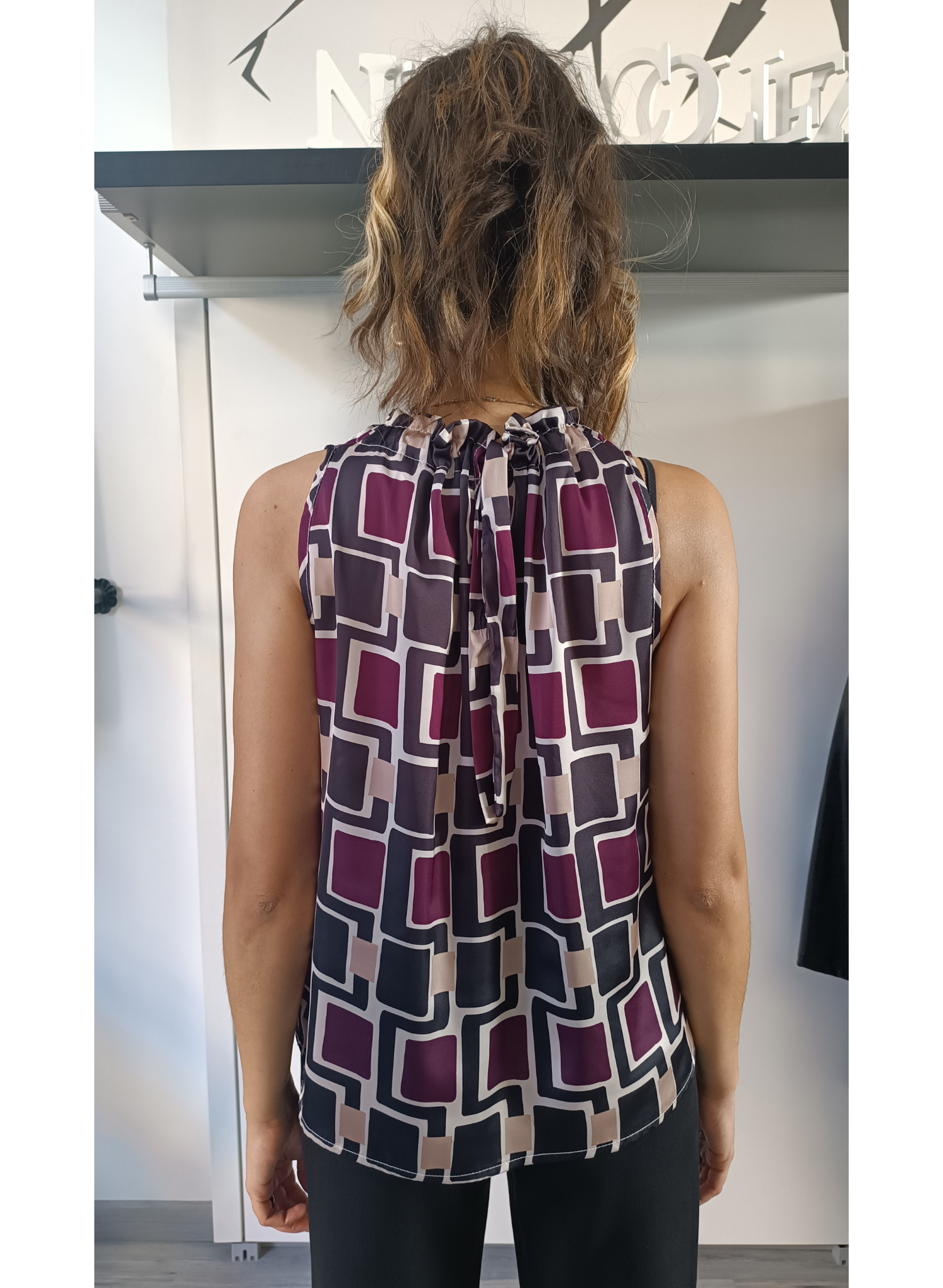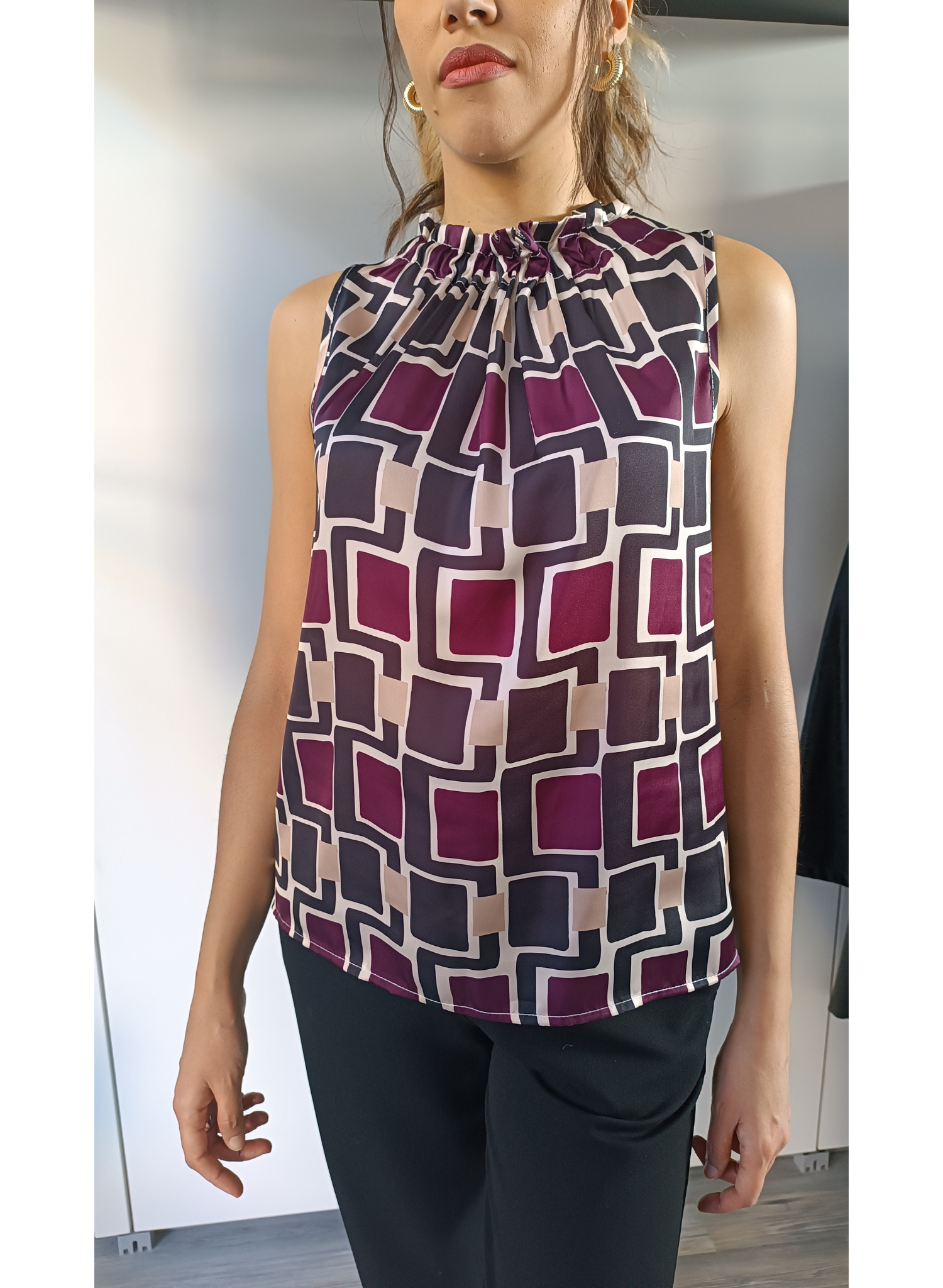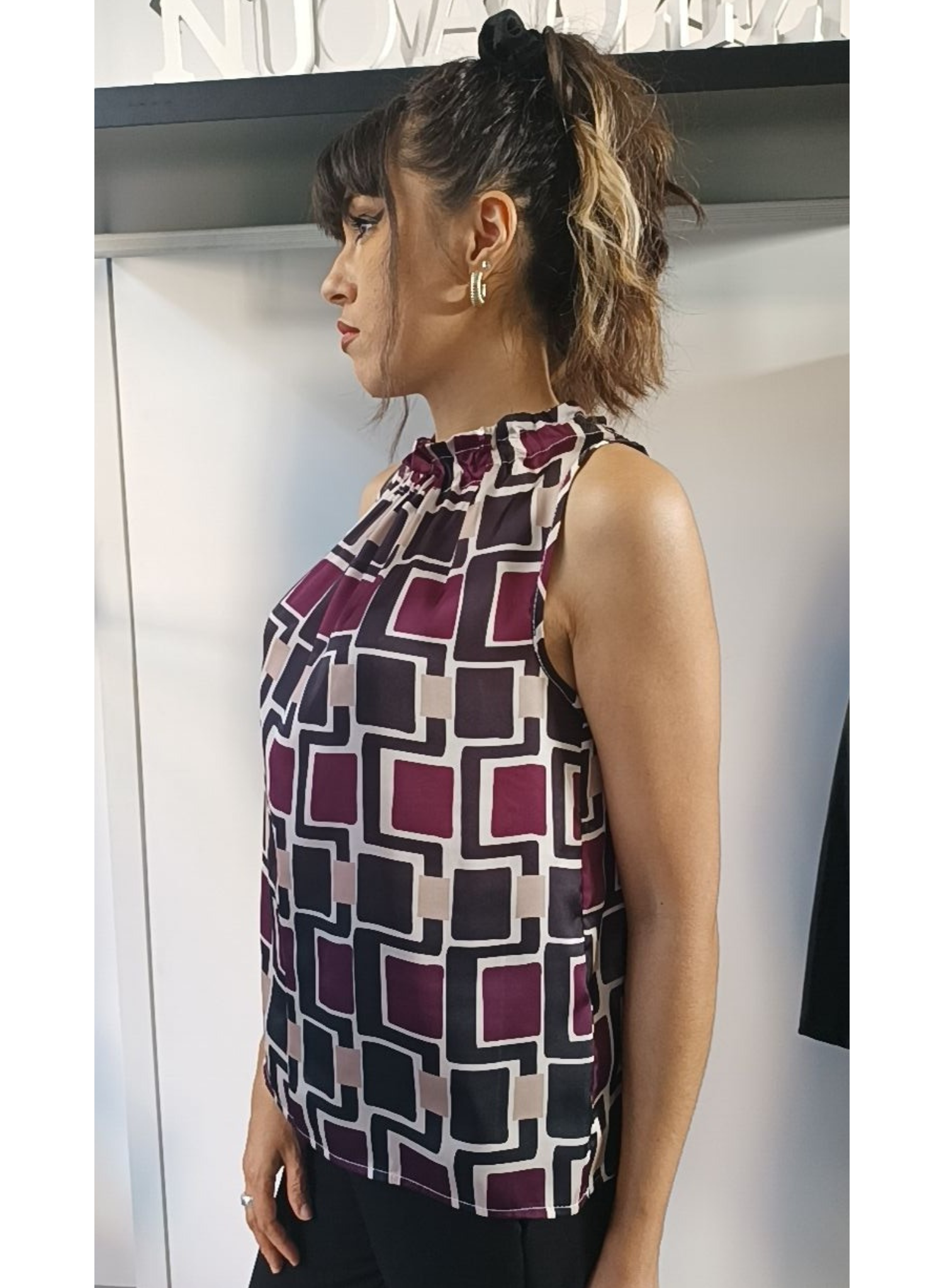 Top in fantasia geometrica, in un tessuto effetto satin, nei colori del burgundy, nero, beige e panna