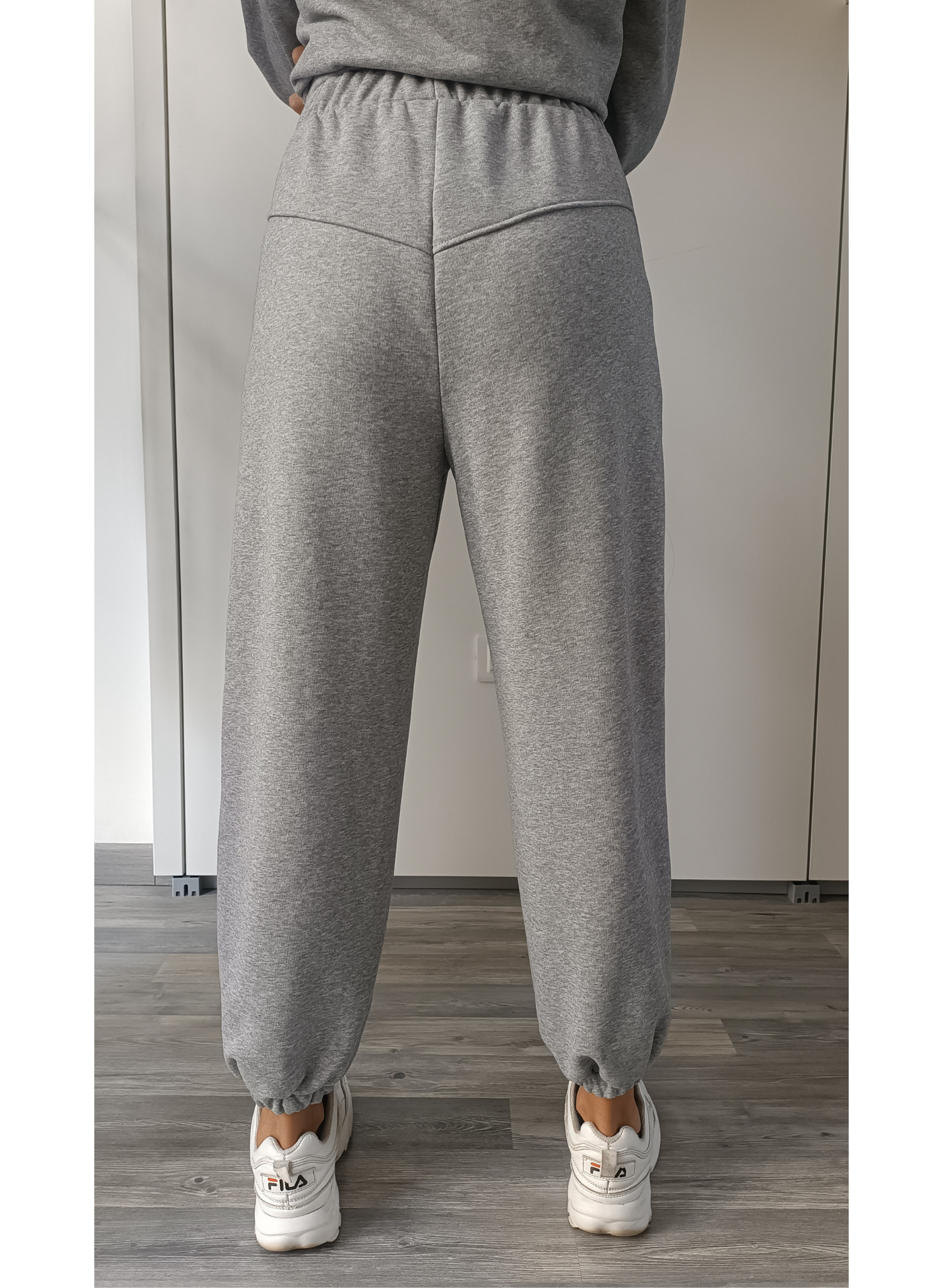 I Pantaloni hanno fascia elastica sul punto vita, gamba più ampia ed elastico sul fondo. Hanno tasche trasversali.